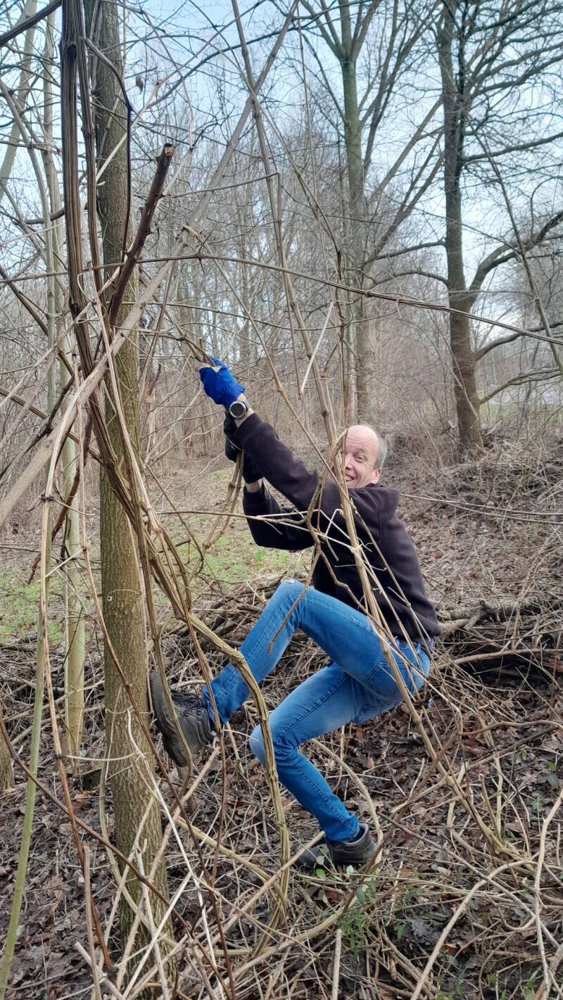Irene maakte deze foto van Roel die probeert een bosrank uit een boom te trekken. Roel wilde ook nog een foto van Irene maken, maar die "viel min of meer uit de boom" dus Roel besloot Irene te gaan redden. Helaas hebben we hier geen foto van... ;-)