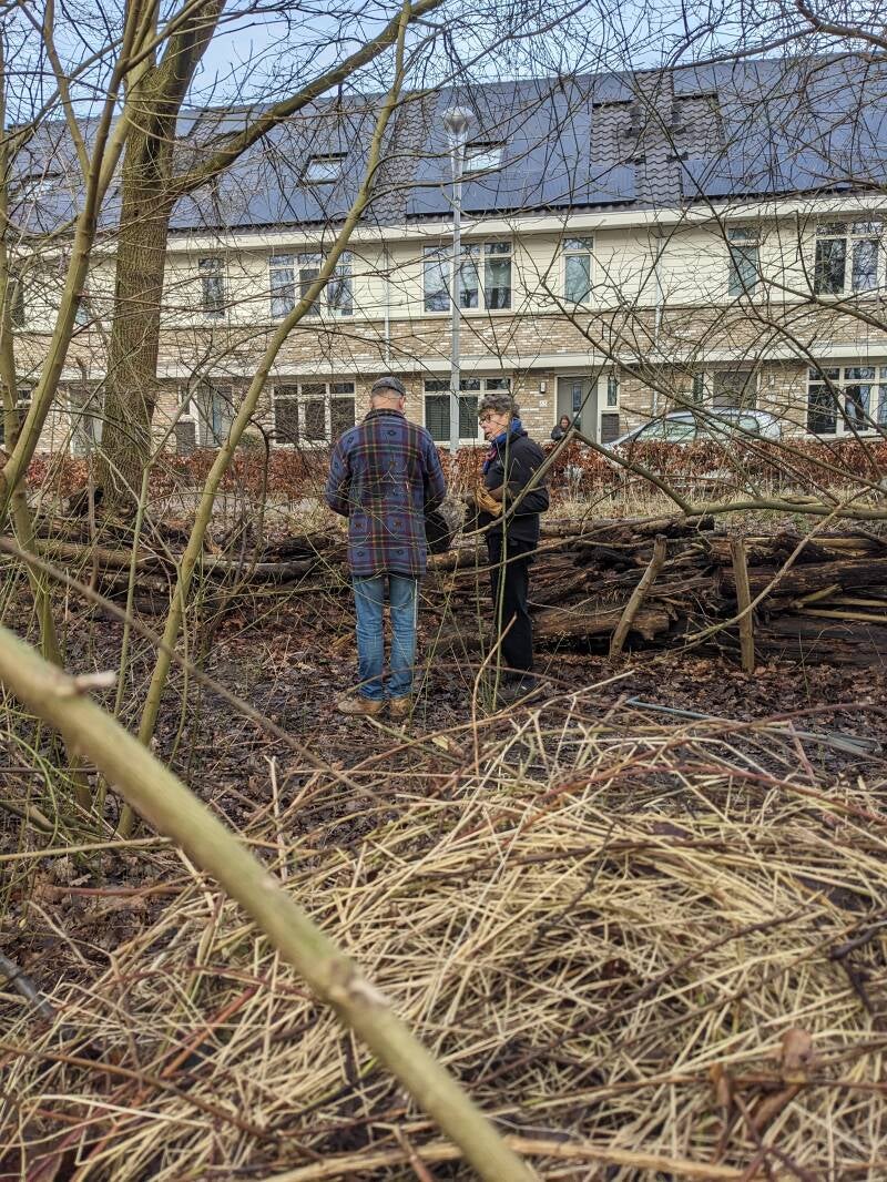 Bij onze collega's van de Hoekwierde was er al volop geknot bij de Knotwilgen. Sia had geregeld dat we een aantal wilgentenen mochten ophalen om te gebruiken in het Kronkelveld. Sven had met de kruiwagen van de buurman al wat lange stevige tenen gehaald.