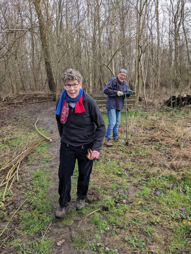 Daarnaast waren er een aantal grote takken over de paden komen te hangen. Deze werden vakkundig door Karen opgeruimd en in de takkenril verwerkt.