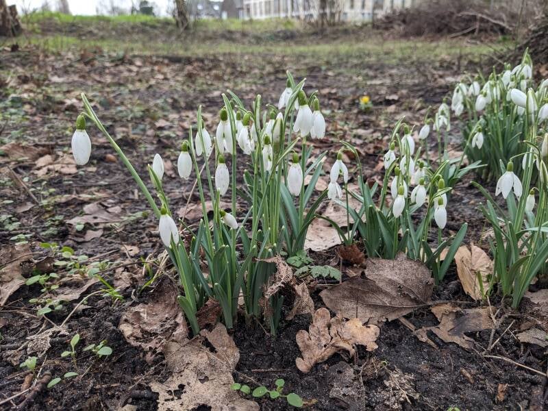 Het was weer een gezellige mooie werkochtend. Wel echt anders dan 3 jaar geleden. Nu zagen we al overal bollen om hoog komen en de eerste groene blaadjes bij verschillende struiken al tevoorschijn schieten.