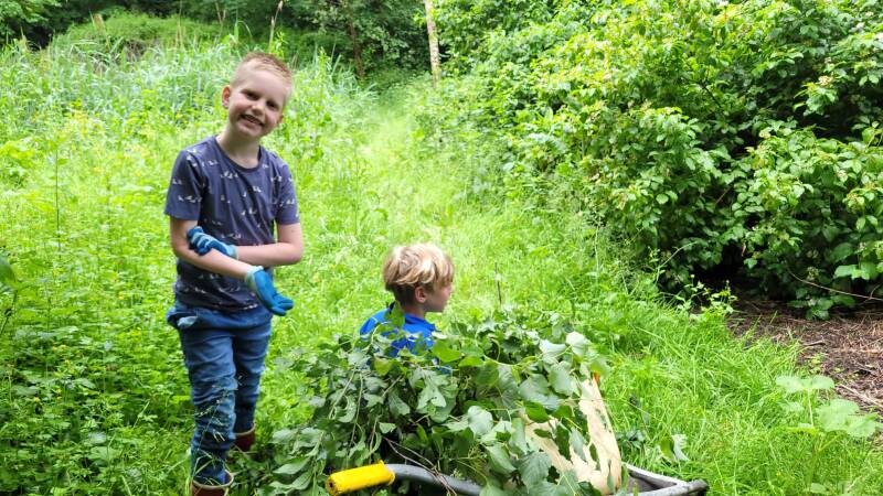 Diny is met haar 80-jarige leeftijd en met de twee jonge jongens aan de slag gegaan met het bijknippen van de struiken en de overhangende takken.