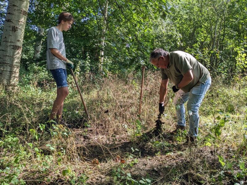 Erik en Thijmen waren bezig geweest met Abelen uitsteken. Dit was bij het veldje naast de picknicktafel.