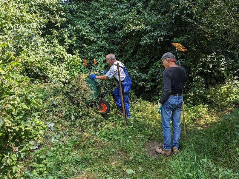 We begonnen vandaag iets later omdat het even duurde om de juiste sleutel te vinden van het schuurtje waar ons gereedschap staat. Gelukkig kon Diny ons uit de brand helpen op deze mooie zomerse dag, de verjaardag van Diny! Nogmaals gefeliciteerd!