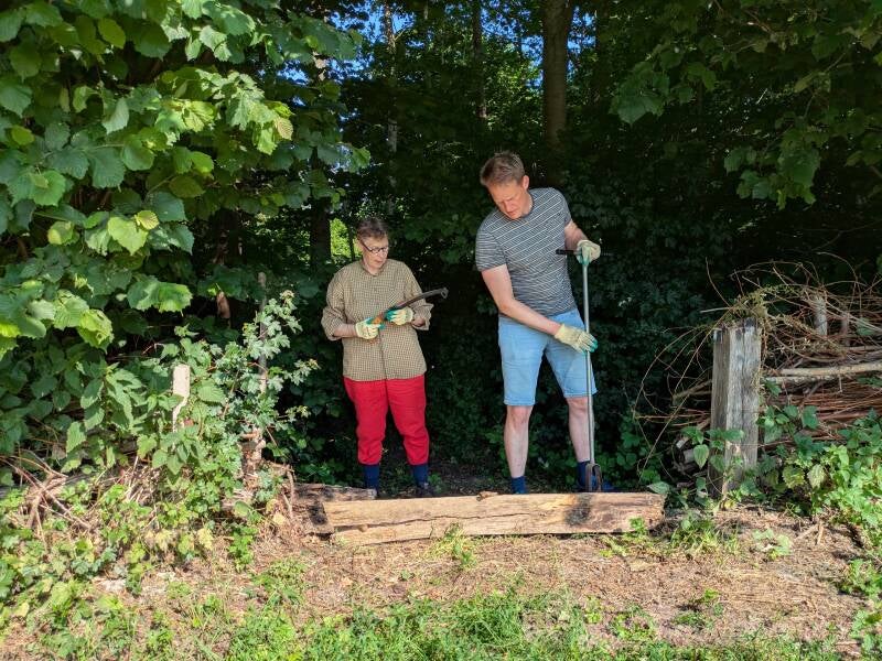 Bart en Sia namen de taak op zich om het hek, dat regelmatig op de grond ligt, tijdelijk weer stevig rechtop te zetten. We zijn nog bezig met de gemeente om een nieuw hek te organiseren.